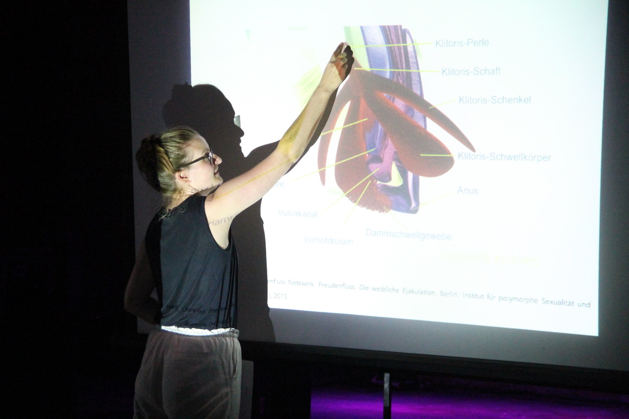 Louisa: It’s basically a 2-3 hrs workshop about the clitoris. Part one is about the clitoris’ anatomy, what it looks like and how it works. For example, in proportion to the average body size of its owner, a clitoris is the same size as the penis: 10-12 cm length. That’s just one fun fact. The clitoris is often seen as that tiny button on top of the vulva, and one has not even heard of its internal part.